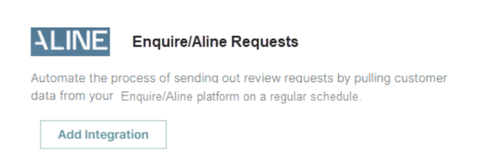 Aline (Enquire): Dedicated to customers in the senior living industry, this connector pulls in data from the Aline CRM, then feeds it into Reputation to automatically send residents and/or their family member a review request.